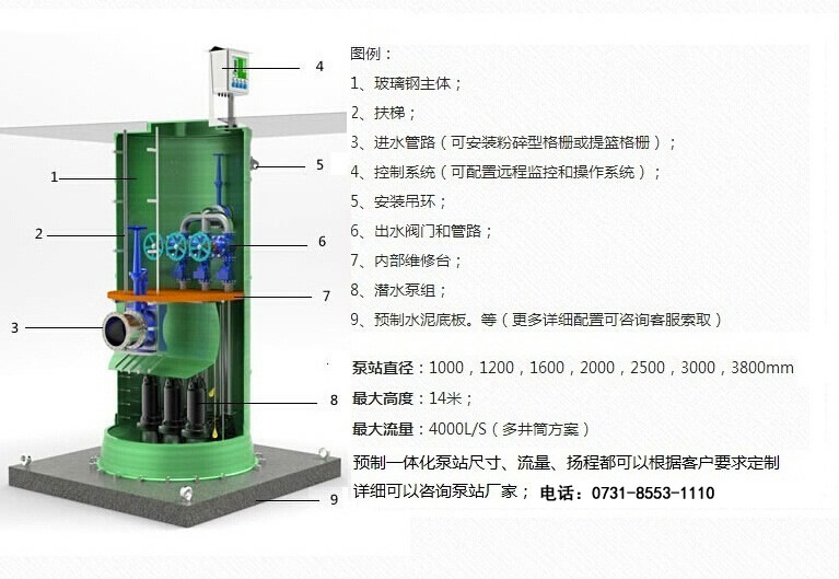 The integration of prefabricated pumping station as a unit, which provides complete: Prefabricated cylinder, submersible sewage pump, pipeline system, crushing grid, intelligent control system, lifting device, exhaust components and so on, can fully meet the requirements of different users.