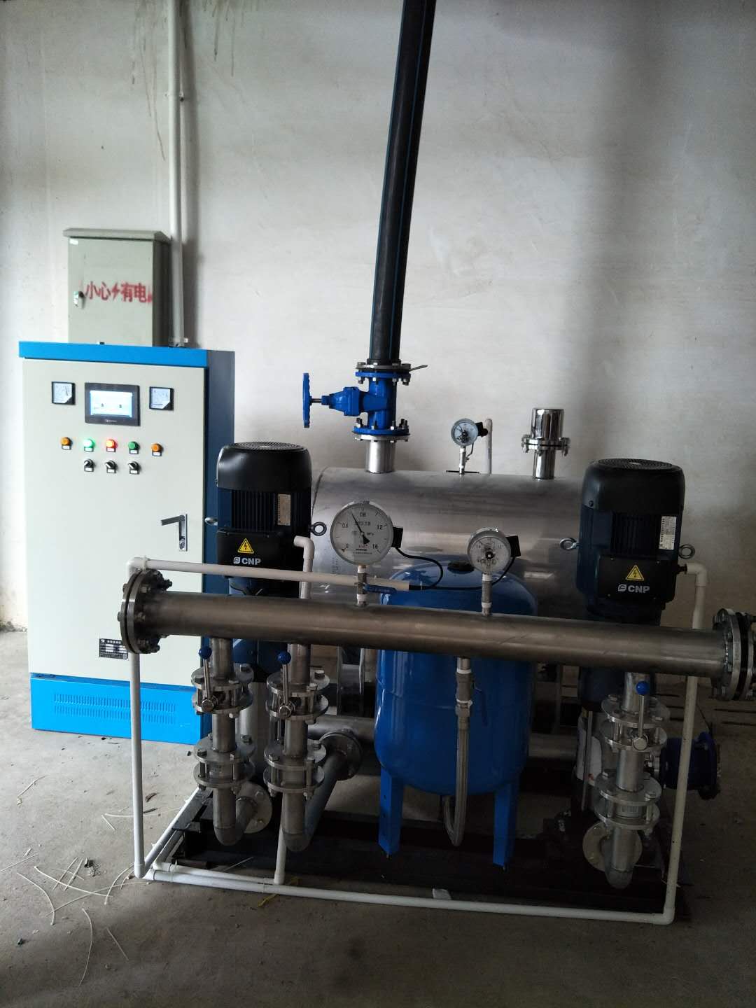 2018.5.14,和平縣興平水電開發有限公司第三次與我司合作,簽訂供水設備購銷合同,用于小區生活供水,次項目有設計院提供設計圖紙,我司技術員根據現場情況及多年技術檢驗設計一套無負壓變頻供水設備,型號ZYW50-50-5.5-2,配兩臺5.5kw不銹鋼加壓泵,一用一備。